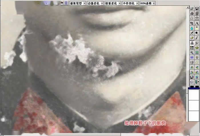 12.此图片最难处理的部分下巴,先将小的脏点漫漫处理掉再去处理比较大的脏块